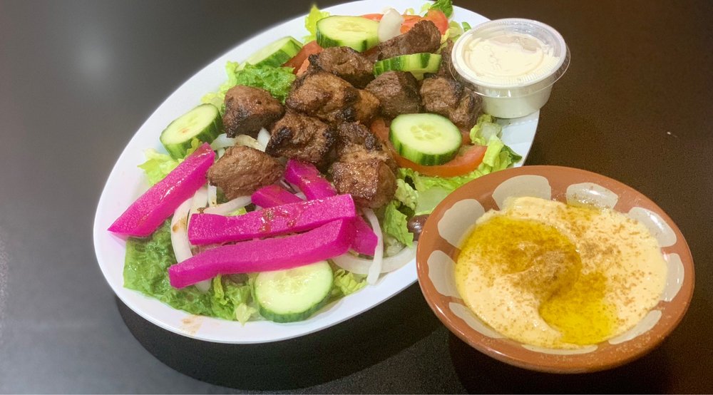 For 3 to 4 people. Hummus, salad and eggplant. Main course is served over rice or french fries with 2 lamb kabobs, 3 chicken kabobs, 3 beef kufta, and a portion of lamb & chicken gyro.
