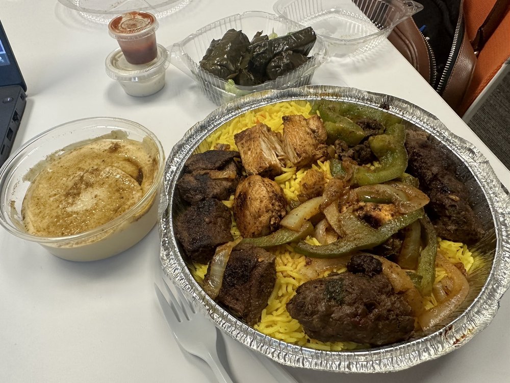 Lamb, chicken, and kufta skewers. Served with pita, veggie, 2 homemade sauces and choice of 2 side.